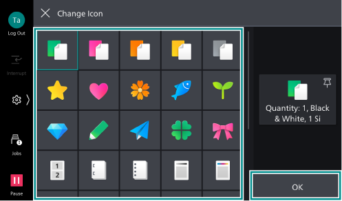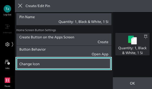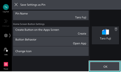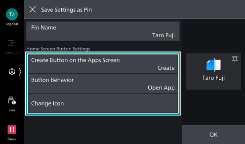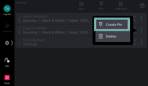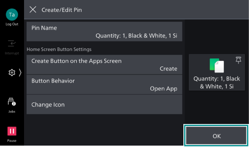 Setting [Create Pin] to the frequently used job parameter set pins it to the upper part of the job history list. The created Pins can be saved also on the Home screen ([Apps] screen).