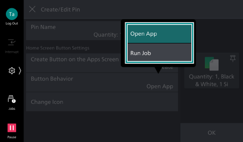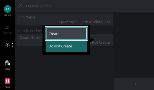 - If you create a Pin button on the Home screen ([Apps] screen), set [Create Button on the Apps Screen] to [Create] and configure the details, including the button behavior.