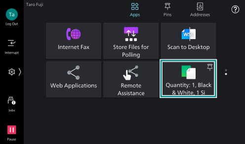 Selecting a previously executed job or a Pinned one from the job history list on [Pins] opens the app screen, enabling you to start the job with the same settings.