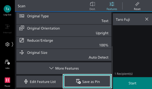 On each app screen, you can create a pin of a job without executing it by saving the destination information and the features list settings.
