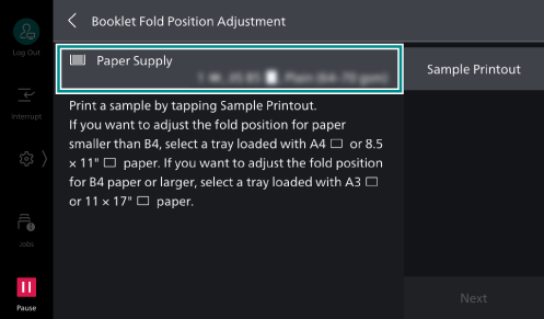 - Tap on [Paper Supply], and select paper with which to make adjustment.