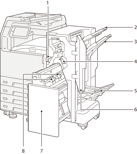 Open this door to clear paper jams, replace the staple cartridge, remove jammed staples or dispose of cut pieces for punched holes. |