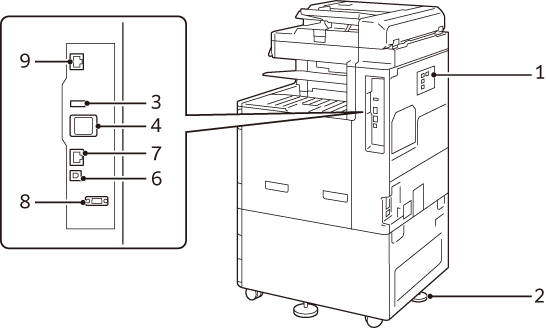 The touch panel display and buttons to operate the machine, and indicators to inform the machine states are located. Refer