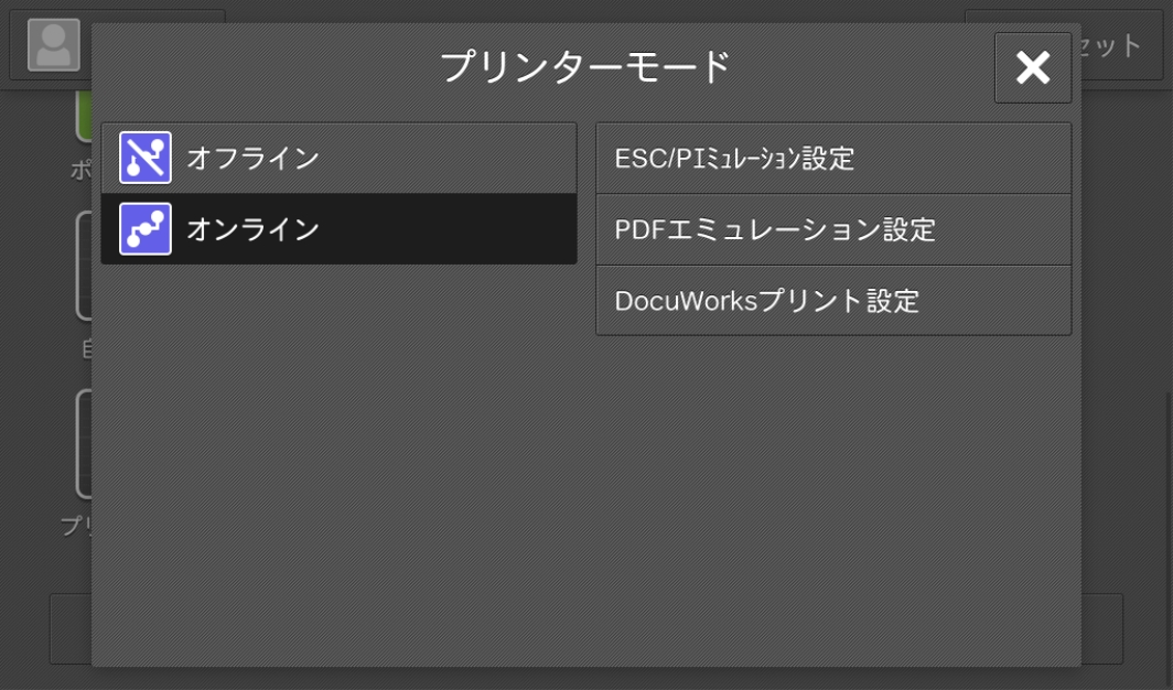 ホーム画面の[プリンターモード]をタップすると、オフライン/オンラインが切り替わります。