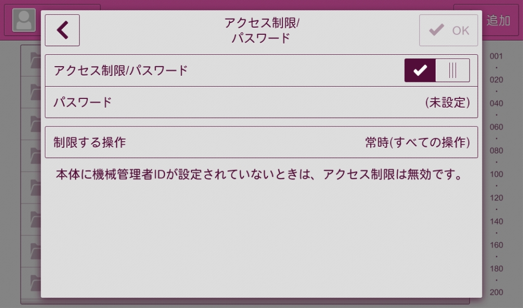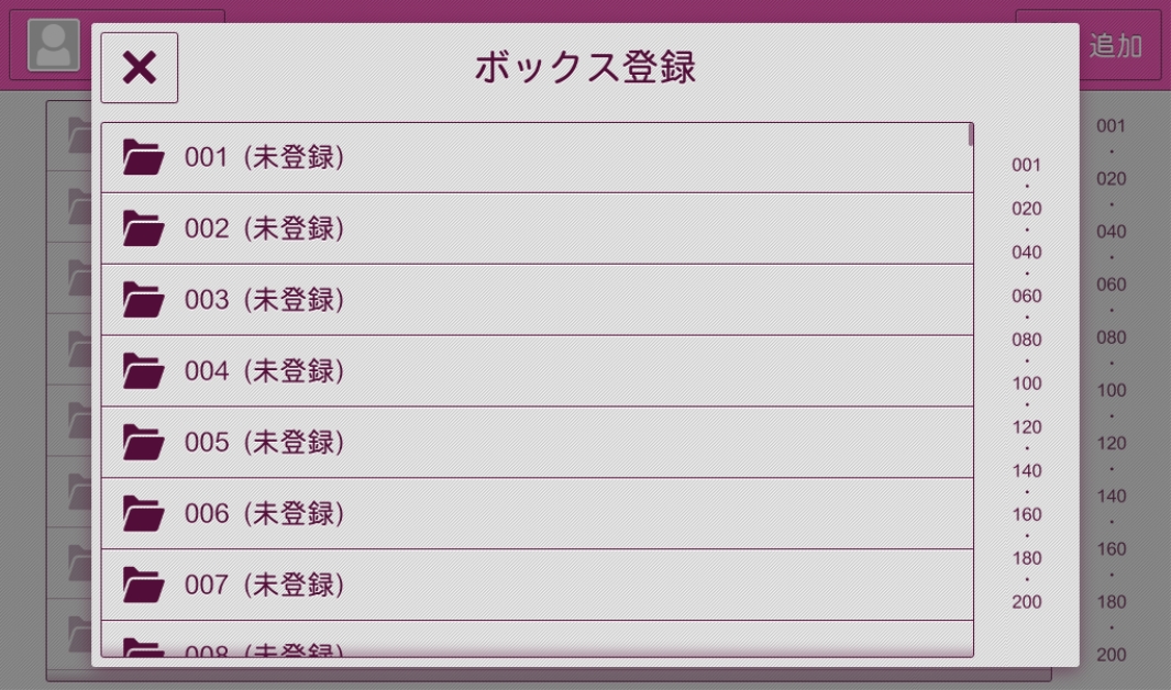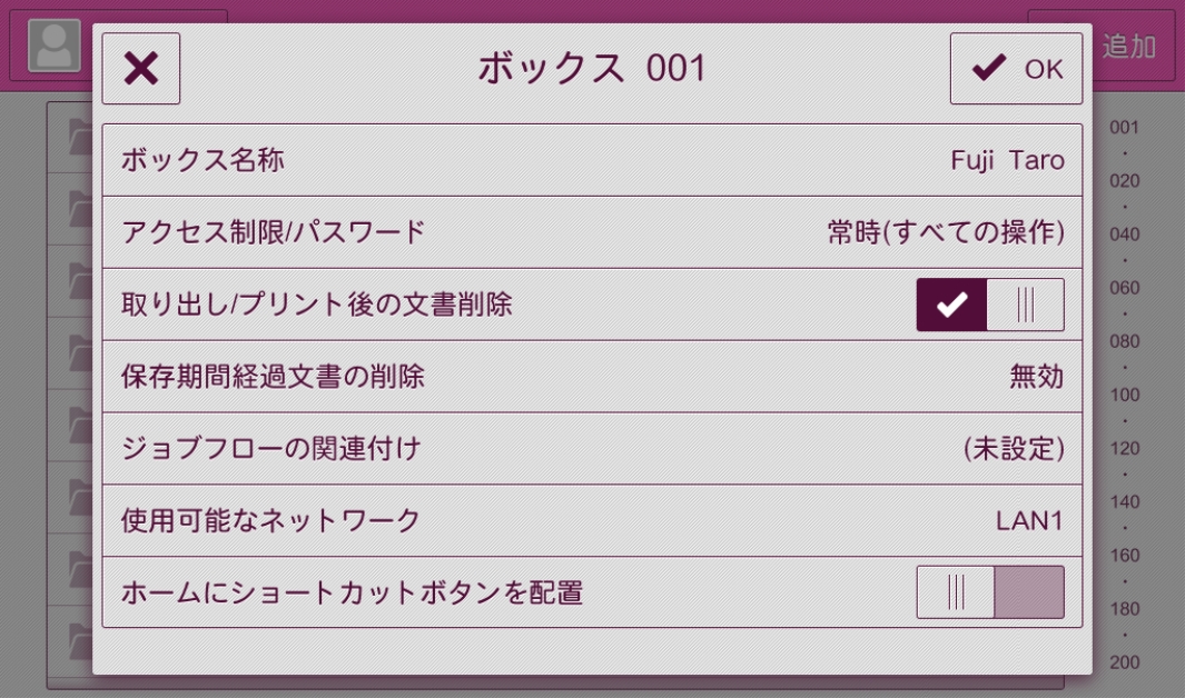 7 親展ボックス 読み込んだスキャン文書や、ファクス文書、クライアントPCから指示したプリント文書を保存する場所です。 また、ボックスに格納された文書のメール送信、文書の確認、プリントを行ったり、ネットワーク上のクライアントPCから取り出したりすることもできます。 個人ボックスや共有ボックスを登録し使い分けることもできます。 親展ボックスの登録 1. [ボックス操作]をタップします。 2. [追加]をタップします。 3. 登録するボックスをタップします。 4. ボックス名称を入力します。 5. [次へ]をタップします。 6. 必要に応じて、各項目を設定します。 アクセス制限/パスワード チェックマークが付いているときは、ボックスへのアクセス制限が有効になります。 パスワード ボックス利用時のパスワードを設定します。 制限する操作 ボックス利用時にパスワードが必要な操作を指定します。 7. [OK]をタップします。 8. 必要に応じて、各項目を設定します。 取り出し/プリント後の文書削除 チェックマークが付いているときは、ボックス内の文書の取り出しやプリントしたあとに、文書が削除されます。 保存期間経過文書の削除 ボックス内に保存されている文書が保存期間経過後に削除されます。 ジョブフローの関連付け ジョブフローを親展ボックスに関連付けできます。一連の作業内容を登録したジョブフローを関連付けることにより、親展ボックス内に保存されている文書の処理方法を設定できます。 使用可能なネットワーク 文書の保存や取り出しに使用されるネットワークを設定します。親展ボックスに文書が保存されている場合は、設定を変更できません。 ホームにショートカットボタンを配置 ホーム画面に親展ボックスのショートカットを作成できます。親展ボックスのショートカットは、最大10 個まで作成できます。 9. [OK]をタップします。