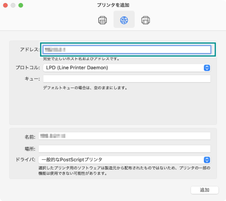 [プロトコル]には、プルダウンメニューから「LPD (Line Printer Daemon)」を選択してください。