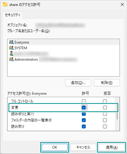 - [アクセス許可:Everyone]欄の[変更]の[許可]にチェックマークを付け、[適用]をクリックします。続けて[OK]をクリックします。
