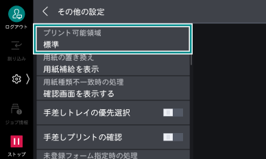プリンタードライバーの[トレイ/排出]タブにある、[とじしろ/プリント位置]>[プリント領域]からも変更できます。