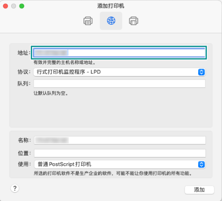 向打印机列表中添加本设备。说明在连接协议中选择IP地址并进行安装的步骤。