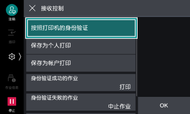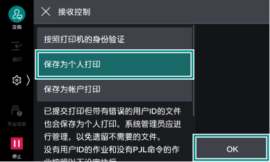 可以设定是否将全部打印作业保存为个人打印,或在本设备接收到打印作业时,对照本设备中登记的用户信息与打印机驱动程序信息,仅将身份验证成功的作业保存为个人打印。