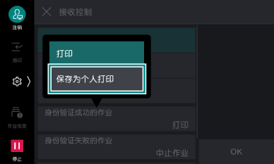 - 轻触[身份验证成功的作业],从显示的菜单中轻触[保存为个人打印]。