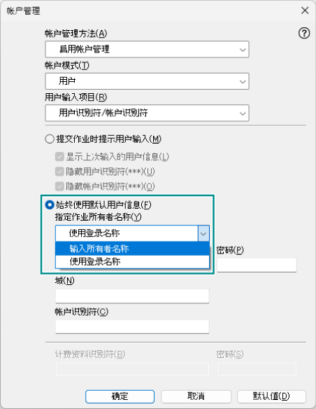 - 选择[始终使用默认用户信息],从[指定作业所有者名称]选择[输入所有者名称]。