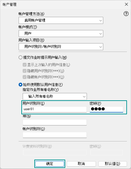 - 在[用户识别符]和[密码]中输入本设备中登记的身份验证ID和密码,单击[确定]。
