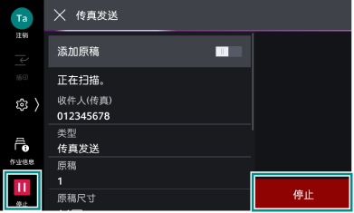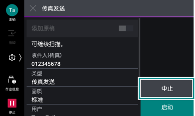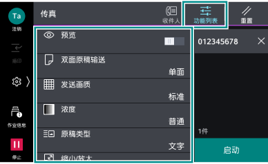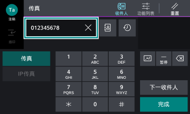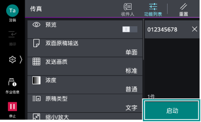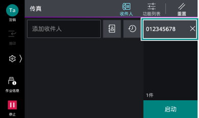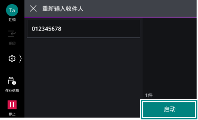 >[设定]>[应用程序设定]>[传真设定]>[传真操作控制]的[重新输入收件人]设定为[有]、[重新输入时的联系人指示]设定为[显示确认画面]时,将显示收件人确认画面。此时,确认收件人正确,再次轻触[启动]。