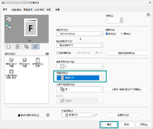 - 在[双面打印]中选择[单面打印],单击[确定]。