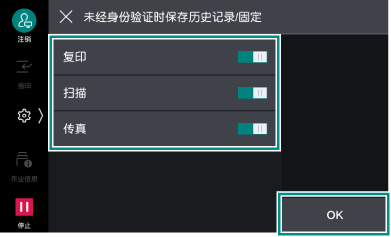 - 将未经身份验证的用户可以保存历史记录的功能设为有效,轻触[OK]。