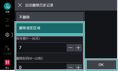 - 选择[删除指定区域],设定保存期和删除时间,轻触[OK]。