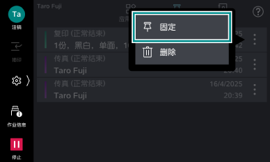 系统管理员模式下,固定的作业指示历史记录显示在所有用户的[固定]画面。