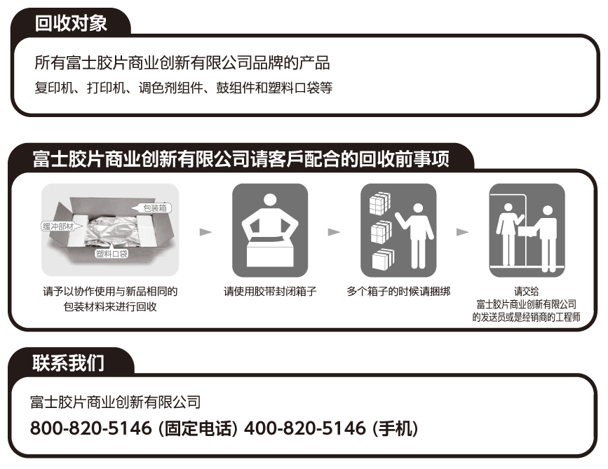 为了保护环境和有效利用资源,本公司回收耗材,以制造可循环使用的零件、材料或者节省能源。
