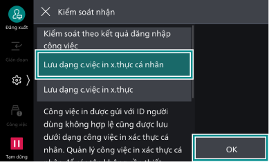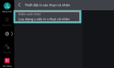 In xác thực cá nhân là chức năng cho phép bạn chỉ in những tài liệu bạn đã hướng dẫn in bằng cách thiết đặt User ID khi hướng dẫn in và thực hiện thao tác xác thực trên thiết bị này. Tài liệu in xác thực cá nhân được lưu lại theo từng ID người dùng xác thực.