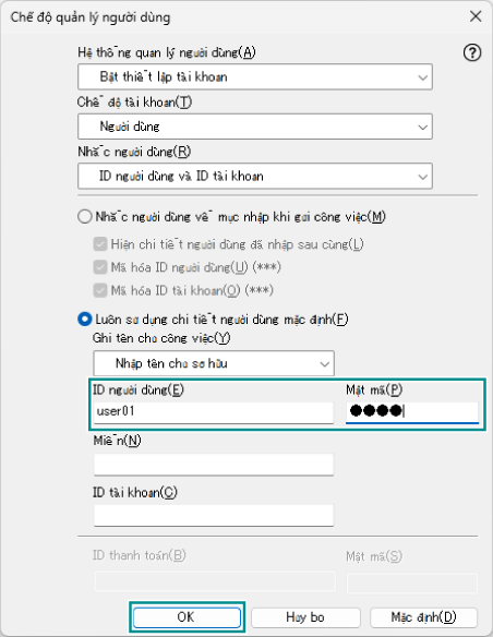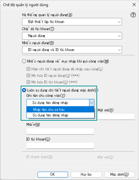 - Chọn [Luôn sử dụng chi tiết người dùng mặc định], chọn [Nhập tên chủ sở hữu] từ [Ghi tên chủ công việc].