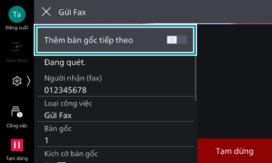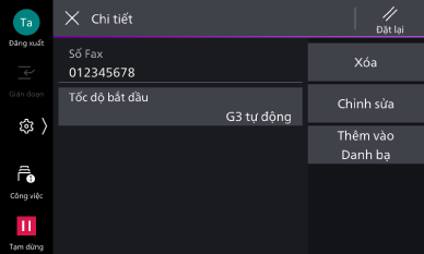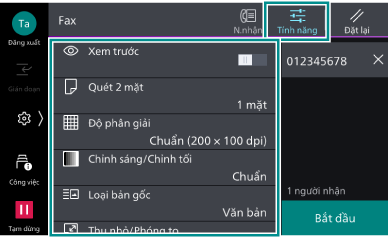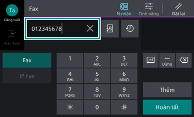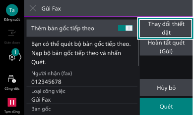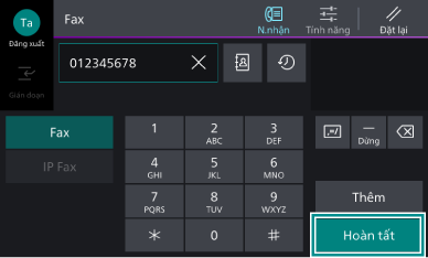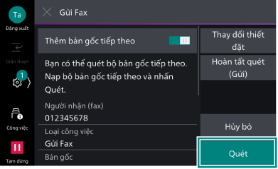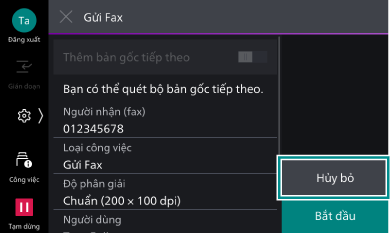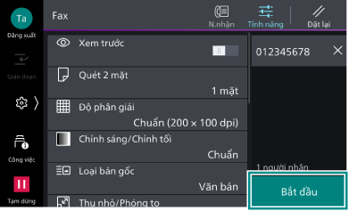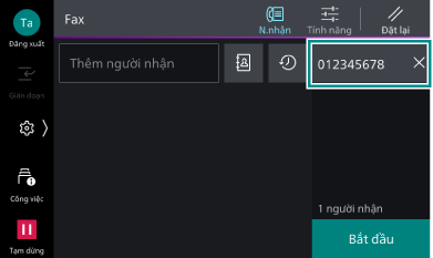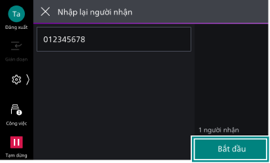 > [Thiết bị] > [Thiết đặt ứng dụng] > [Thiết đặt Fax] > [Điều khiển Fax] của chế độ Người quản trị hệ thống, nếu [Nhập lại người nhận] được thiết đặt thành [Bật], [Người nhận đã chọn từ Danh bạ] được thiết đặt thành [Hiển thị màn hình xác nhận], màn hình xác nhận địa chỉ người nhận sẽ được hiển thị. Trong trường hợp đó, hãy kiểm tra xem địa chỉ người nhận đã chính xác chưa và nhấp lại vào [Bắt đầu].