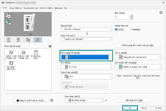 - Trong [Dồn trang (N-Up)], chọn [4], và nhấp vào [OK].