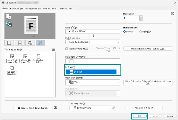 - Trong [In 2 mặt], chọn [In 1 mặt], và nhấp vào [OK].