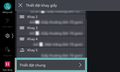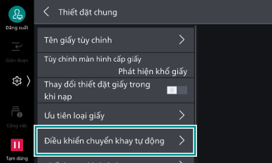 - Nhấp vào [<] để quay trở lại màn hình, [Thiết đặt chung] sau đó nhấp vào [Điều khiển chuyển khay tự động].