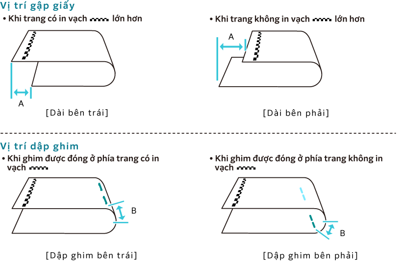 - Xác nhận vị trí gập giấy và vị trí dập ghim của mẫu được in.