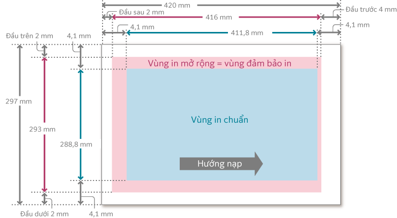 Đối với khổ A3 hoặc nhỏ hơn, "vùng in mở rộng" = "vùng bảo đảm in".