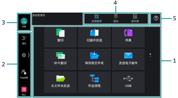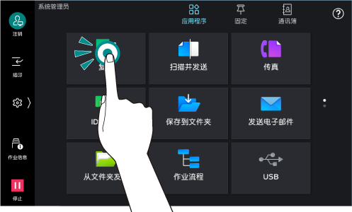 进行系统管理员模式和身份验证功能的登录/注销时,轻触此区域。