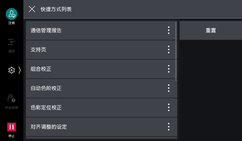 ,可以变更功能的排列顺序,或从列表删除功能。轻触[重置],恢复到出厂时的状态。在可以登记的功能画面上轻触右上方显示的[创建快捷方式]后,添加到[快捷方式列表]。