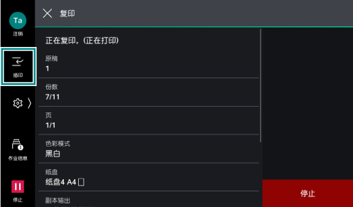 能够在连续复印过程中或打印过程中,暂时中断执行中的作业,优先处理其他作业。此处以连续复印过程中使用插印功能的复印为例进行说明。