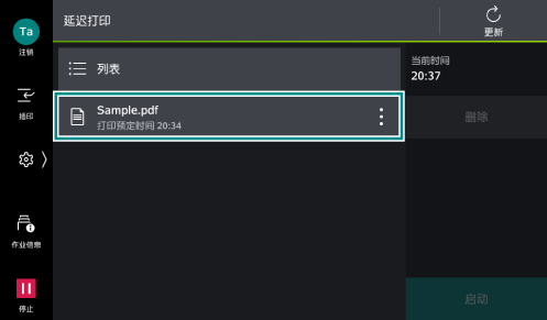 >[作业信息]>[保存文件]>[延迟打印]。 - 轻触要打印的文件。