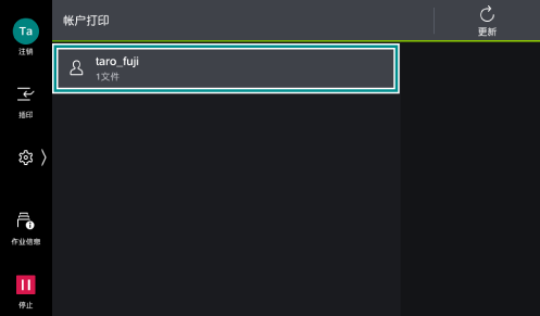 打印帐户打印文件。帐户打印文件按在打印驱动程序中设定的保存用户ID保存。没有设定用于保存的用户ID时,保存在[(无用户ID)]中。