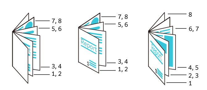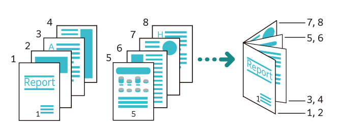 为了将多张原稿装订成册子(骑马订小册子),按页码顺序进行版面设计后复印。此外,小册子创建时,可以设定装线或加附封页。