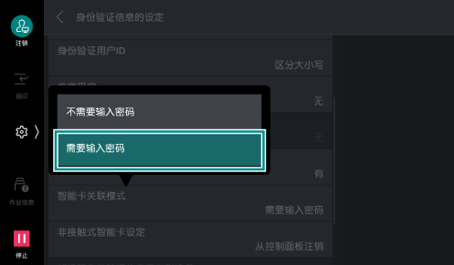 >[设定]>[身份验证/记帐]>[身份验证/安全设定]>[身份验证设定]>[身份验证信息的设定]。 - 轻触[智能卡关联模式]>[需要输入密码]。