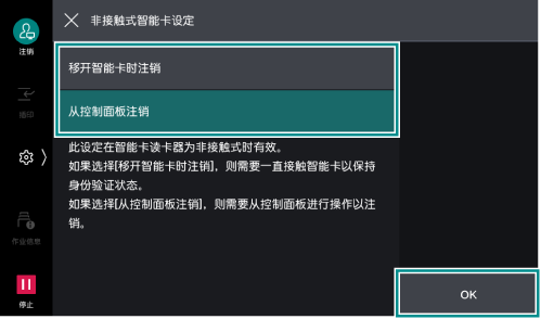 >[设定]>[身份验证/记帐]>[身份验证/安全设定]>[身份验证设定]>[身份验证信息的设定]>[非接触式智能卡设定]。 - 选择登录的解除方法,轻触[OK]。